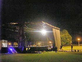 | 夜中に知らない街を歩くのはちょっと怖いという思いはあったものの、「せっかくなので」という思いが止められず、クリスマスキャロルとミサに参加することに。 | 夜中もやっているカジノの横を通り、北ハグレー公園へ。と、綺麗なクリスマスツリーがあり、周辺には意外なほどたくさんの人が集まっていました。 | キャンドルナイトにつかわれるはずだったステージ撤収中。こんな夜中にやらなくてもと思いつつも、動員さんのスケジュールでこうなったのかなあとか(笑)。 |