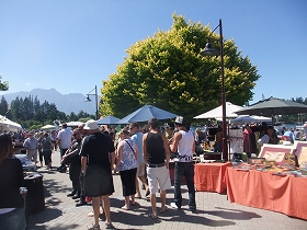 | 戻ってきたら湖畔でフリーマーケットをやっていました。いくつか欲しいものがあったものの、次にオーストラリアへ行くので農産品や木製品を持ちこめず断念。 | 最後の食事ということで、これも人気のFlame Bar & Grillでミックスグリルを。ステーキ&スペアリブ&ラムチョップ&ソーセージ。すさまじく肉。なんとか完食! | 空港へは「スーパーシャトル」という乗り合いタクシーで。荷物は後ろのワゴンに乗せます。何度も出たり入ったりしたクィーンズタウンともいよいよお別れです。 |