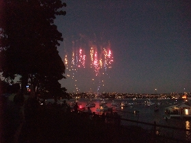 | ポイントの一番奥まで来たところでよさげな場所があったので確保。水上(海上)にいくつもの船や家?が浮かんでます。パーティーとかして楽しそうだなぁ…。 | 21時の花火(お子様向けで始まったらしい)もかなりの迫力。でも、これだったら、単なる大規模花火で、シドニーならという気はしないなと思い、場所を移動。 | というこで、なんとかハーバーブリッジの雰囲気が分かる場所へ。写真写りは全然でしたが、実は生身の目ではどうなっているかが、かなり良く分かりました。 |
