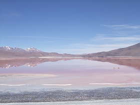 | 昨日見たLAGUNA COLORADAを逆側から再度。フラミンゴが渡って行きます。 | 赤い湖面が見事に鏡になっています。なかなか見事です。 | 谷をずっとウユニに向かって下っていきます。これもなかなかビックリの道です。 |
