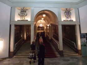| 客席はいわゆるオペラハウスの作りで、馬蹄形にステージを取り囲んでいる。ただ、ウィーン国立歌劇場などに比べると日本のホールに割と近いイメージ。 | 客席はほぼ日本と同じだが、席と席の間がかなり大きく空けて取ってあり、さらに3人のボックス席や個室があったりもするのが、多少違ったところ。 | バレエはさすがで、特に人々の群舞に感動。動いているだけで人に感動を与えることもできるのだなと再発見。歯さえ痛くなければいい時間だったのだが…。 |